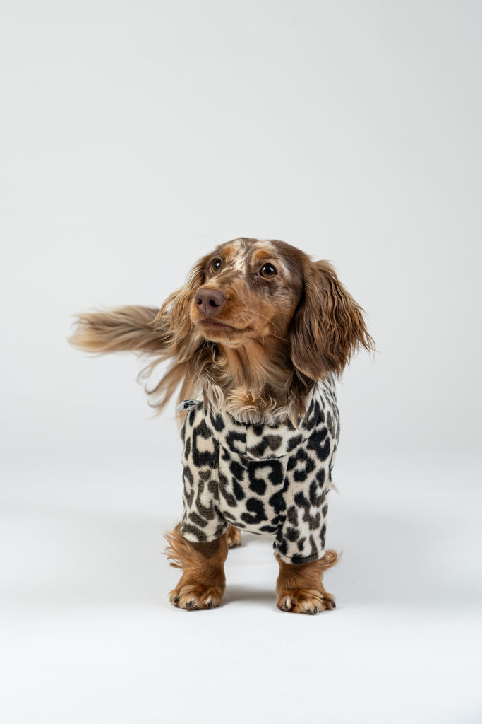 Unser Polar Fleece Pullover ist die perfekte Wahl für alle, die auf hochwertige Dackel Kleidung setzen. Der Dackel Pullover in Leo ist ein echter Hingucker für modebewusste Vierbeiner. Mit seinem angesagten Animal-Print setzt er ein klares Statement in Sachen Dackelmode – wild, mutig und stilvoll zugleich. Dieser speziell für Dackel entwickelte Pullover bietet optimalen Schutz vor Kälte und Zugluft. Egal ob beim Spaziergang, beim Spielen im Garten oder bei gemütlichen Stunden im Haus, die durchdachte Passform sorgt für besten Sitz und uneingeschränkte Bewegungsfreiheit.