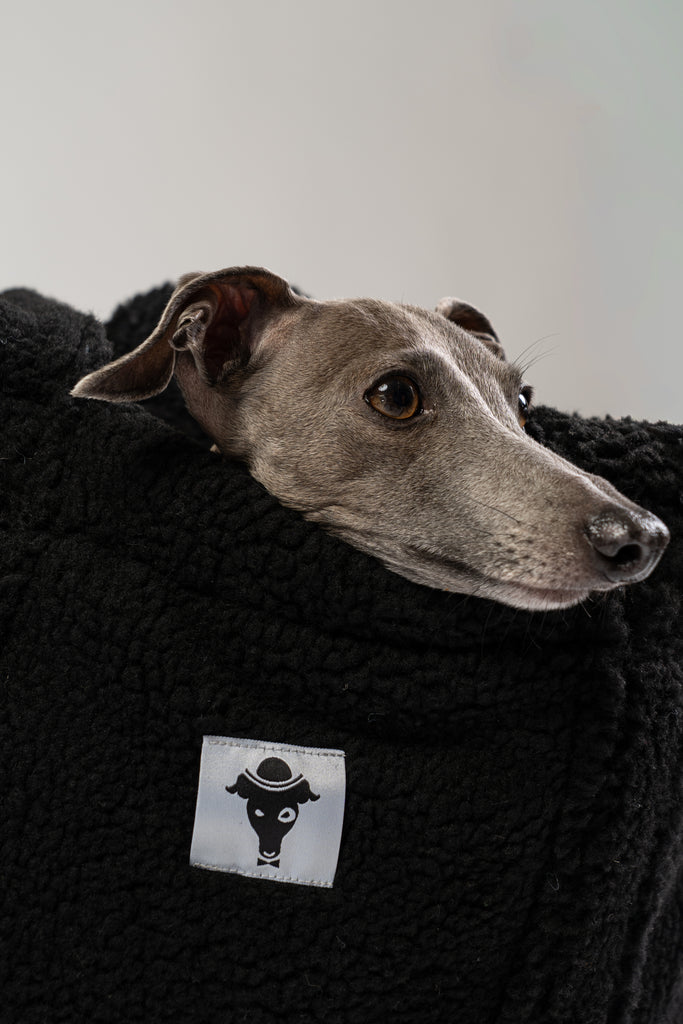 Italienisches Windspiel liegt gemütlich im schwarzen Teddy Shopper von Karma Hund – weiche Hundetasche und mobiles Reisebett aus flauschigem Teddy-Stoff.