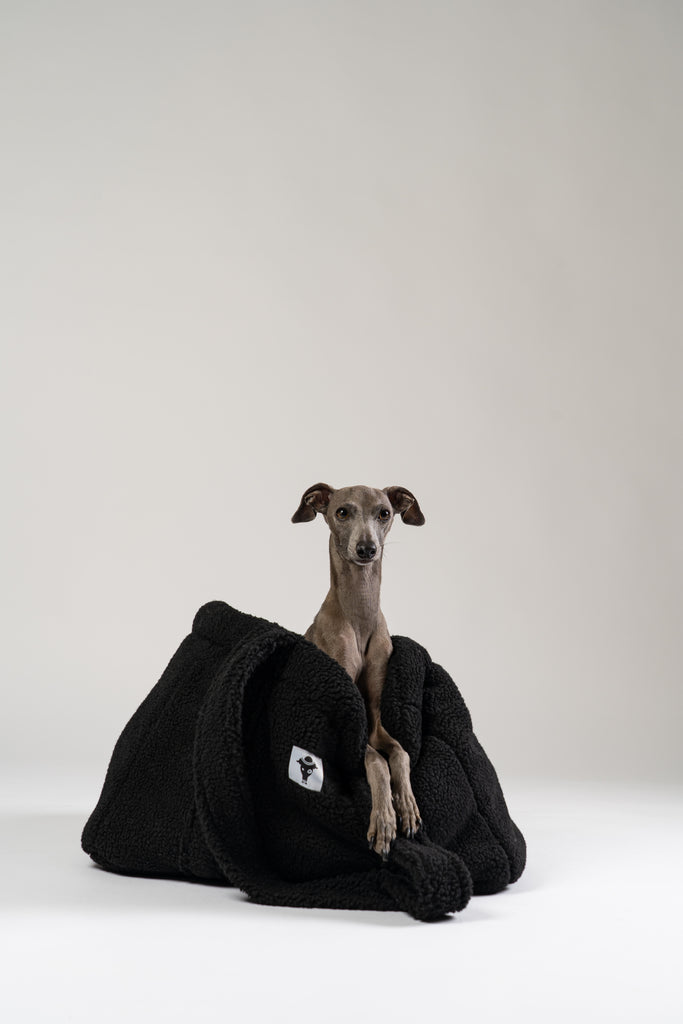 Kuscheliger schwarzer Teddy Shopper von Karma Hund – luxuriöses mobiles Reisebett für kleine Hunde, gezeigt mit italienischem Windspiel.