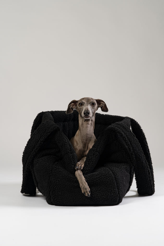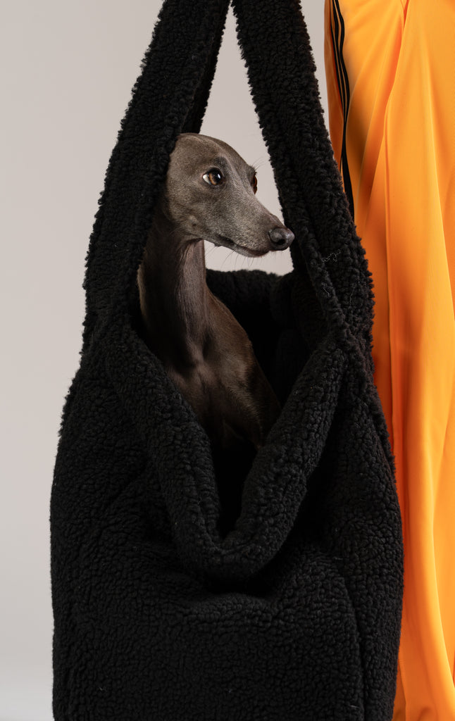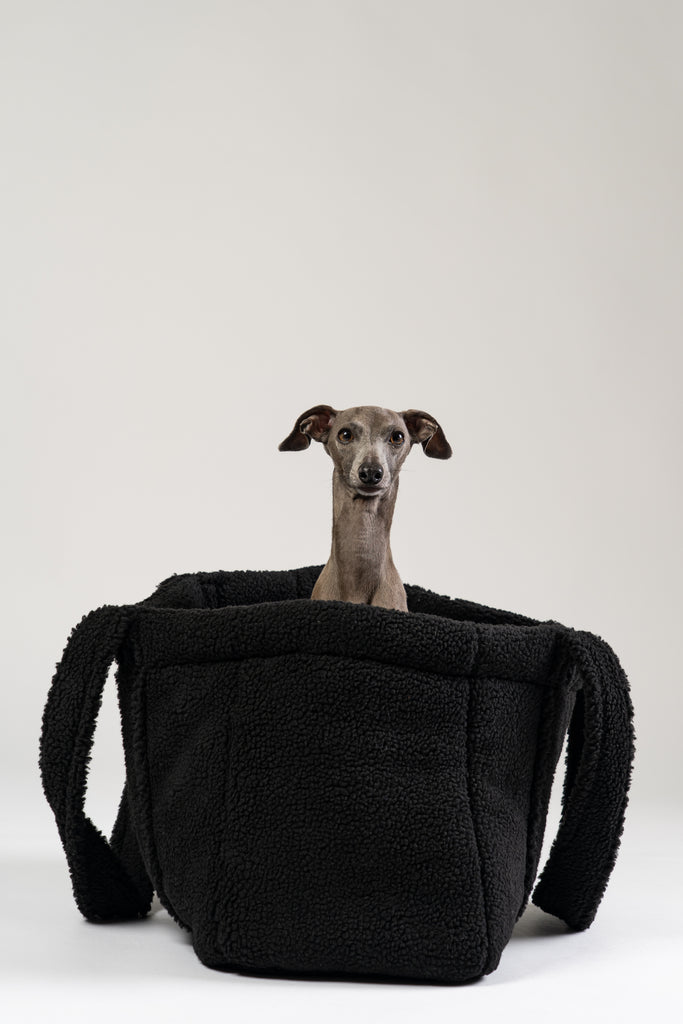 Flauschiger schwarzer Teddy Shopper von Karma Hund – eleganter Rückzugsort und Tragetasche für kleine Hunde, mit italienischem Windspiel.