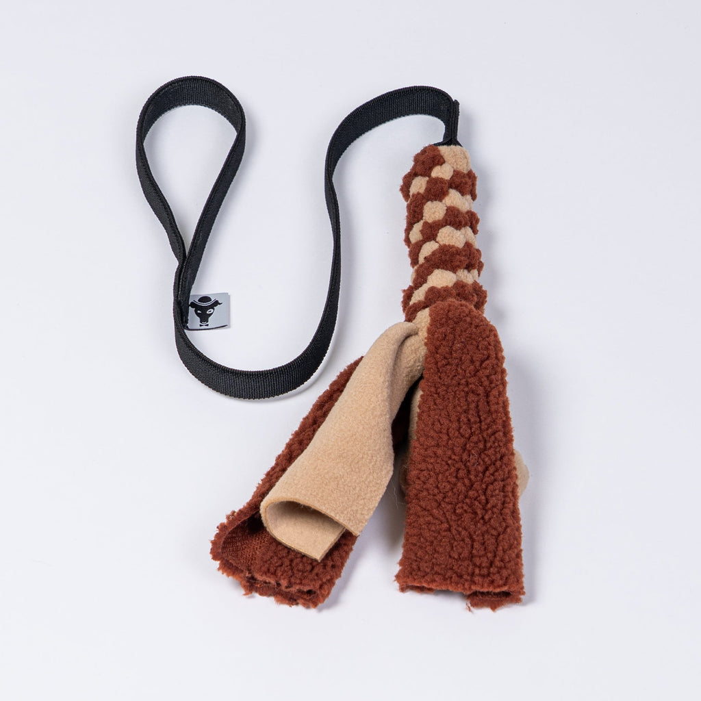 Auf einer Seite findest du einen ca. 30 cm langen, handgeflochtenen Fleece-Zopf mit fluffigen Fransen, ideal zum Jagen, Zerren und Festhalten. Auf der anderen Seite ist ein elastisches, 20 mm breites Gurtband verarbeitet. Es ist wie ein Mini-Bungee-Seil, das sanfte, gelenkschonende Bewegungen ermöglicht und ruckartige Krafteinwirkungen dämpft. Perfekt für alle Hunde, die glauben, sie müssten beim Ziehen den Baum umpflanzen.