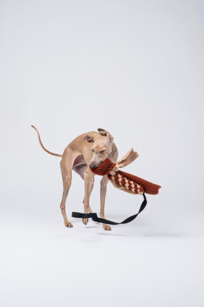 Bitte lass deinen Hund niemals unbeaufsichtigt mit dem Spielzeug spielen. Kein Spielzeug ist unzerstörbar, es besteht immer ein Risiko, dass es beschädigt wird oder Verletzungen entstehen können.