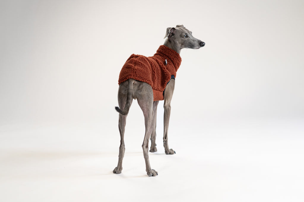 Detailaufnahme Hundepullover in Brown, weicher Teddy-Stoff für kleine Windhunde
