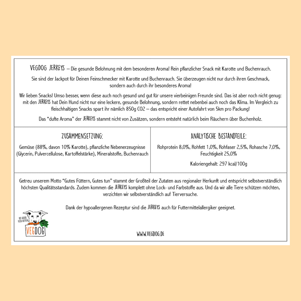 Die VEGDOG Jerkeys eignen sich ideal als kleine Belohnung oder Snack zwischen den Mahlzeiten. Bitte immer frisches Wasser bereitstellen.